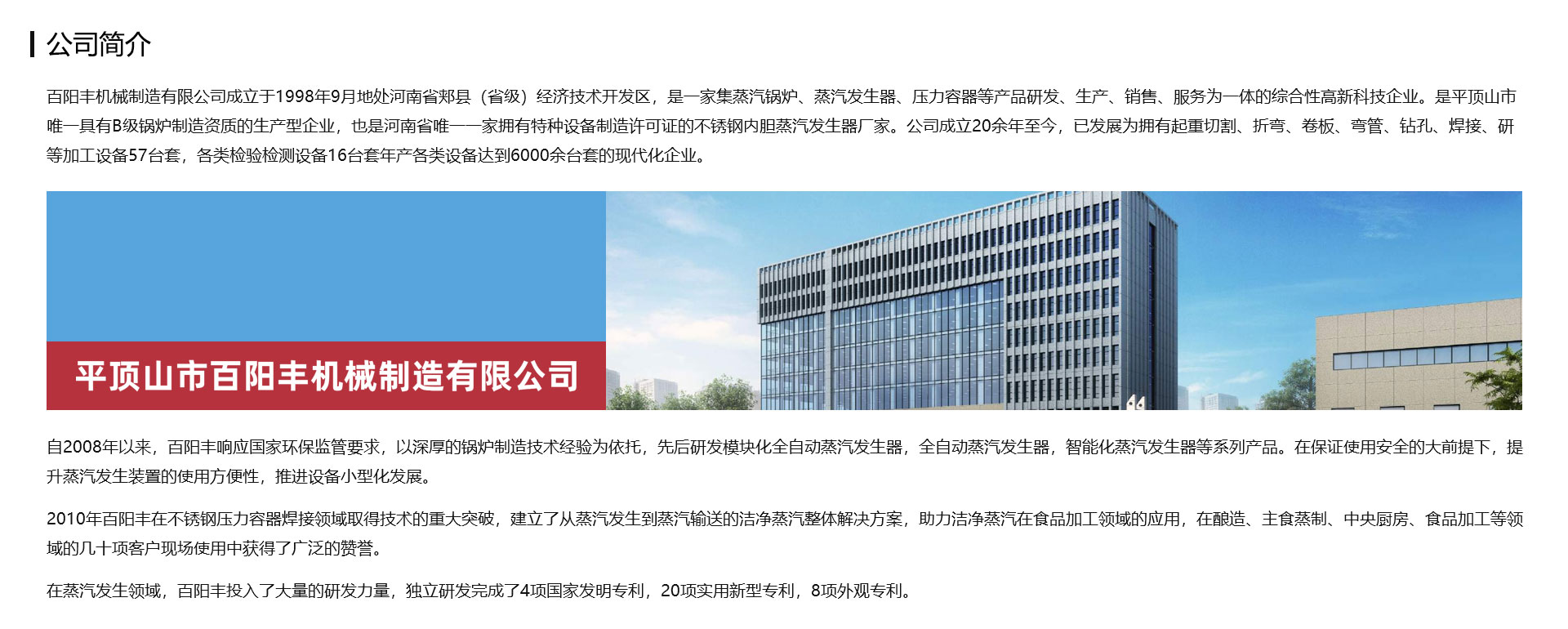 百陽豐機(jī)械制造有限公司成立于1998年9月地處河南省郟縣(省級(jí))經(jīng)濟(jì)技術(shù)開發(fā)區(qū),是一家集蒸汽鍋爐、蒸汽發(fā)生器、壓力容器等產(chǎn)品研發(fā)、生產(chǎn)、銷售、服務(wù)為一體的綜合性高新科技企業(yè)。是平頂山市一家具有B級(jí)鍋爐制造資質(zhì)的生產(chǎn)型企業(yè),也是一家擁有特種設(shè)備制造許可證的不銹鋼內(nèi)膽蒸汽發(fā)生器廠家。公司成立20余年至今,已發(fā)展為擁有起重切割、折彎、卷板、彎管、鉆孔、焊接、研等加工設(shè)備57臺(tái)套,各類檢驗(yàn)檢測(cè)設(shè)備16臺(tái)套年產(chǎn)各類設(shè)備達(dá)到6000余臺(tái)套的現(xiàn)代化企業(yè)。